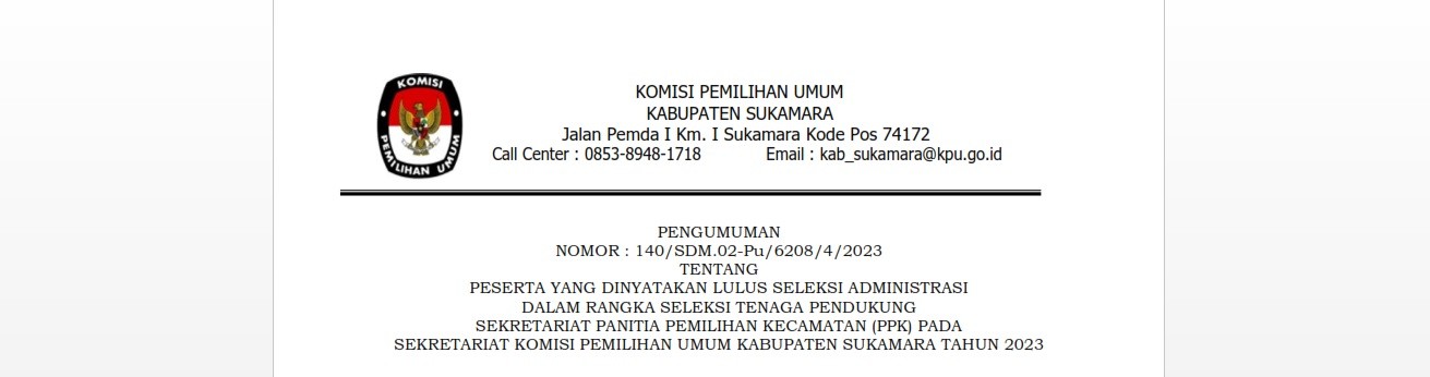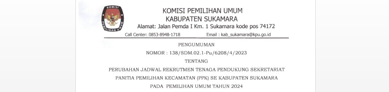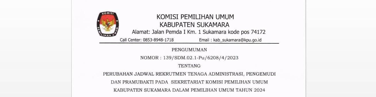 2023, melalui Pengumuman ini diberitahukan bahwa terdapat perubahan jadwal pelaksanaan rekrutmen tenaga administrasi, pengemudi dan pramubakti pada Sekretariat KPU Kabupaten Sukamara sebagaimana terlampir pada Lampiran yang merupakan